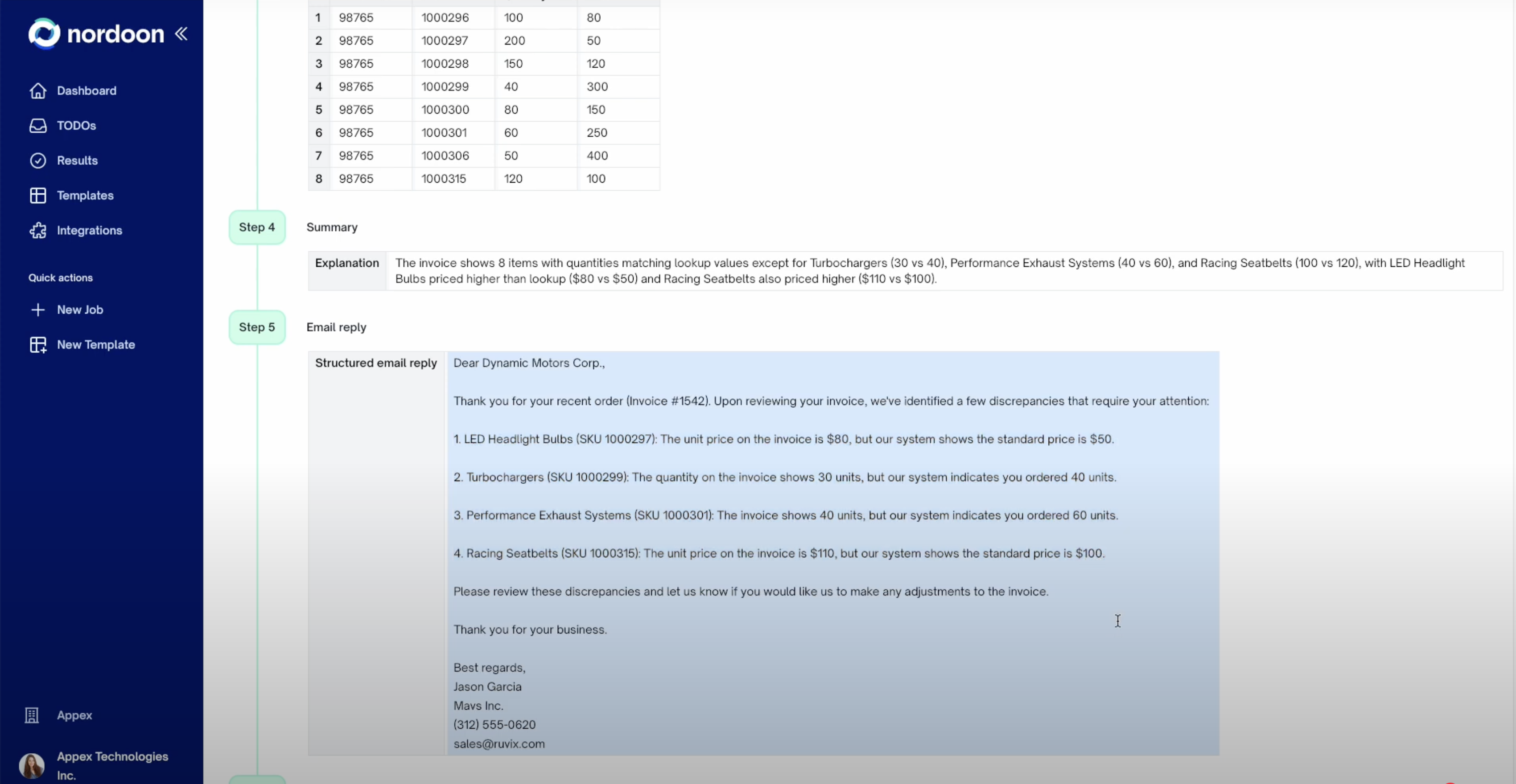 Manual reconciliation drains time and causes costly delays. Nordoon AI Agents can automate the process end to end, from matching SKUs and prices to generating summaries and supplier emails. With just one setup, your team can eliminate repetitive checks and get clean, reliable invoice validation in seconds.