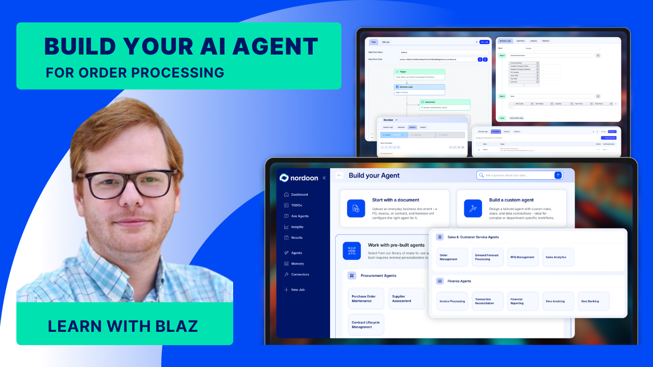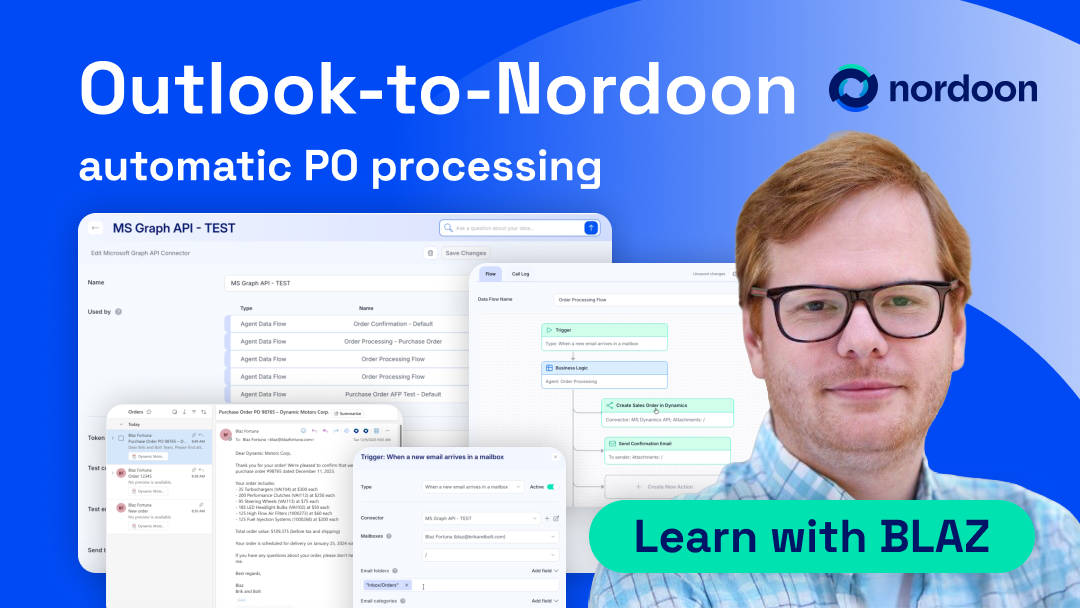 In this video, you'll learn how to create and set up an AI Agent that automatically processes purchase orders for you. As Nordoon integrates directly with Microsoft Outlook, your Agent picks up new order-processing tasks as emails arrive. It manages the entire workflow: extracts the relevant data, updates your ERP system, and alerts you for review whenever something falls outside the business logic you’ve defined. This video shows you how to get the Agent started.