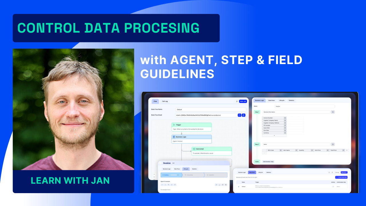 In this video, you will learn how to use agent, step, and field guidelines to control data processing with Nordoon's AI Agents. In the context of maintaining a purchase order, you will learn how to refine an agent that processes email updates to POs. The video walks you through adding guidelines at 3 levels (agent, step, and field) to extract only the latest PO versions, remove version suffixes from identifiers, and normalize quantity formats to pieces without units.