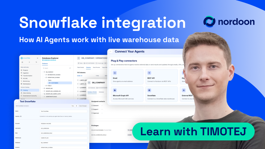 This tutorial shows how to integrate Nordoon with your Snowflake Data Warehouse so AI Agents can work with live warehouse data. The integration is designed to be lightweight and controlled. Agents query Snowflake on demand, using your existing access rules, so they always work with the most current data without copying or duplicating it.