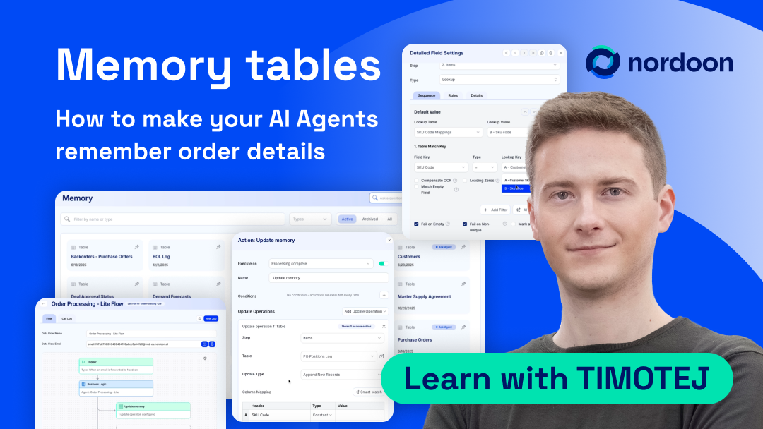 This tutorial shows how to use Memory Tables so AI Agents can store, reference, and reuse order details during processing. You’ll see how Agents extract data from purchase orders, map customer and item identifiers using existing tables, and write structured results back into Memory Tables for later use.