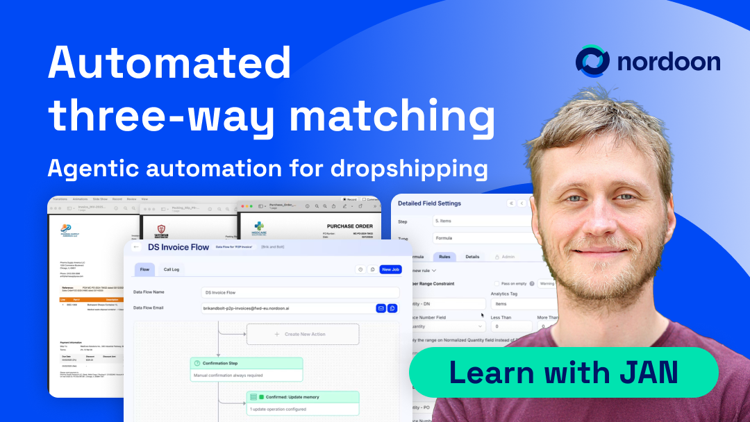 Three-way matching in dropshipping is straightforward in theory and fragile in practice. Invoices, packing slips, and order confirmations come from different parties, use different identifiers, and rarely line up cleanly. This tutorial walks through a real dropshipping document flow and shows how Nordoon Agents handle three-way matching end to end.